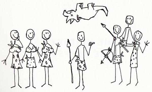 Urk o gece kankaları sayesinde mağaradaki en dişe dokunur hatunları götürürken, diğerleri ertesi gün kimin kahraman olacağını (Urk bir hafta kahraman olamayacaktı) belirlemek üzere taş, taş, taş oyunu oynarlardı. Erkekler bir sonraki avda çabucak bir hayvan öldürür, sonra günün geri kalanını avlanma sahnesini nasıl canlandıracaklarını prova ederek ve hangi mağara hatunlarının giyinik halde daha güzel görüneceğini tartışarak geçirirlerdi. Bütün gün avla uğraştıkları mitini yaratmak mağara adamlarına iki açıdan faydalı olmuştu; erkeklerden biri kolayca hatun düşürüyordu ve diğerleri de bütün gün toplayıcılık yapmaktan ve dırdır çekmekten kurtuluyorlardı.