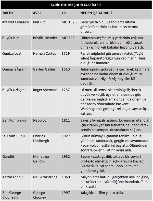 Takdim ettiğimiz bu taktik kolleksiyonu Barney Stinson’ın eşi bulunmaz zekasının bir ürünü olmakla birlikte, kesinlikle yeni bir çalışma değildir. Kadınları baştan çıkaracak entrikalar geliştirmek tarihin doğuşundan önce bile erkeğin en önemli meşguliyetlerinden biri olmuştur. Bunun kanıtları tarih öncesi mağara resimlerinde görülür.